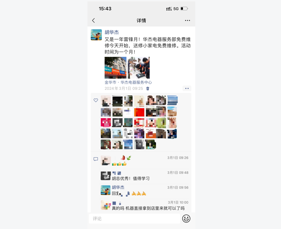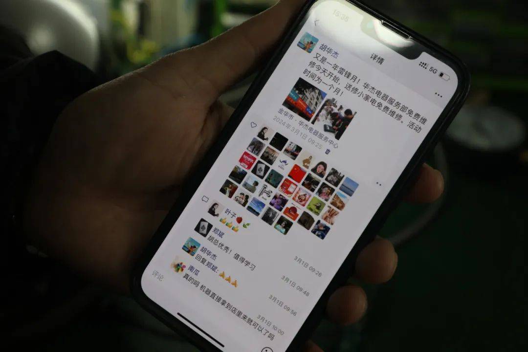 3月1日一大早,胡华杰发了一条朋友圈:“又是一年学雷锋月!华杰电器服务部免费维修今天开始……时间为一个月。”