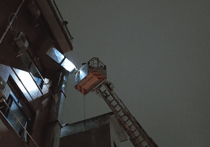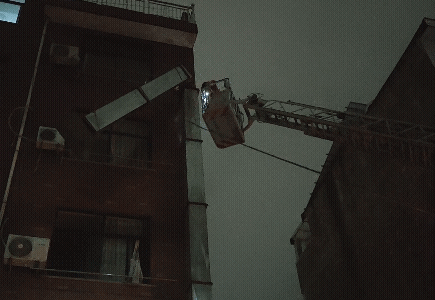 消防救援人员到场后发现,被吹弯的铁皮烟囱正悬在顶楼外墙处,岌岌可危。消防救援人员立即做好防护,乘云梯车抵达高处,对烟囱做好固定和牵引,随后进行破拆,成功将其转移至安全位置。