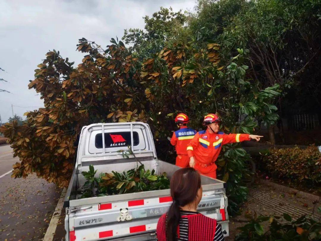 3月25日17时24分,武义县壶山街道一棵大树被风吹倒后正好压在一辆小货车的车头位置,驾驶员被困车内。
