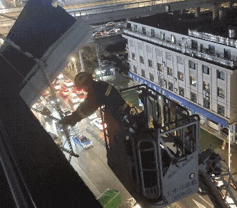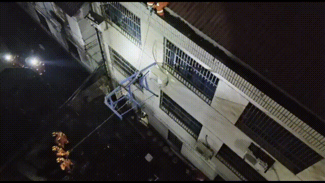 消防救援人员先用一根绳索将铁板从上固定,一根绳索从下牵引,随后由另一组消防员在顶楼里侧用钢筋剪剪断钢棚连接处,最后众人合力将其缓缓放至地面。