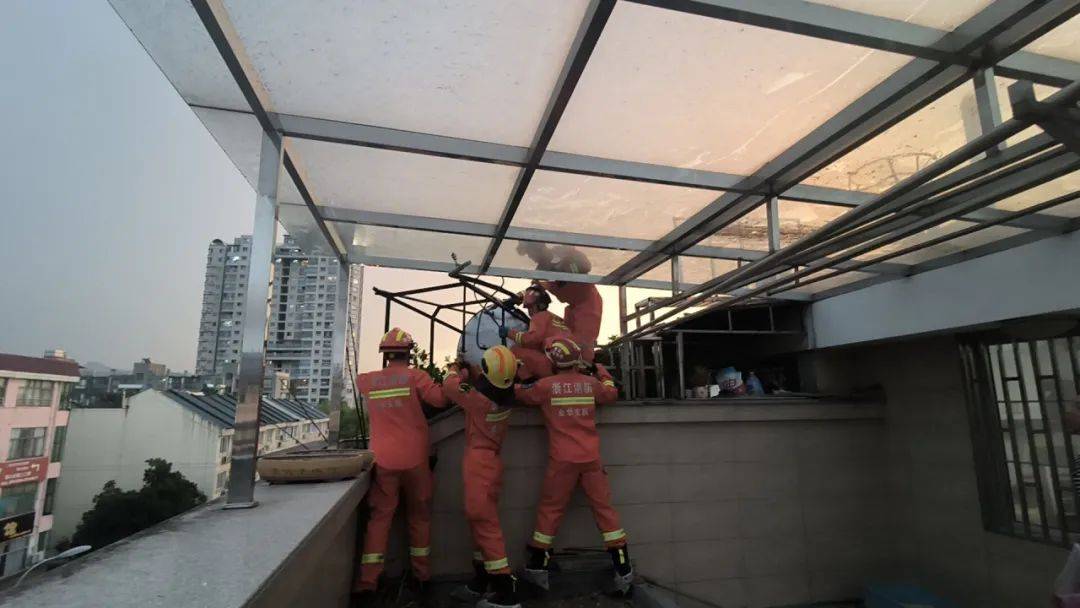 3月25日17时39分,武义县壶山街道一居民楼顶的太阳能热水器被风刮倒悬挂半空,随时可能发生坠落,周围群众发现后急忙报警求助。