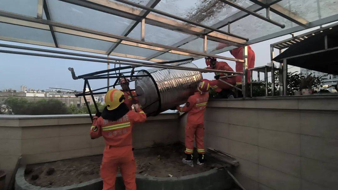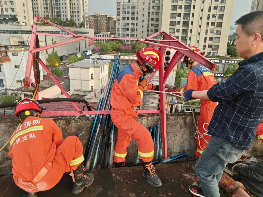 在确保安全的情况下,消防救援人员携带腰带、安全绳等工具登上楼顶,对钢架进行绑定,合力将钢架放置于一楼安全位置。