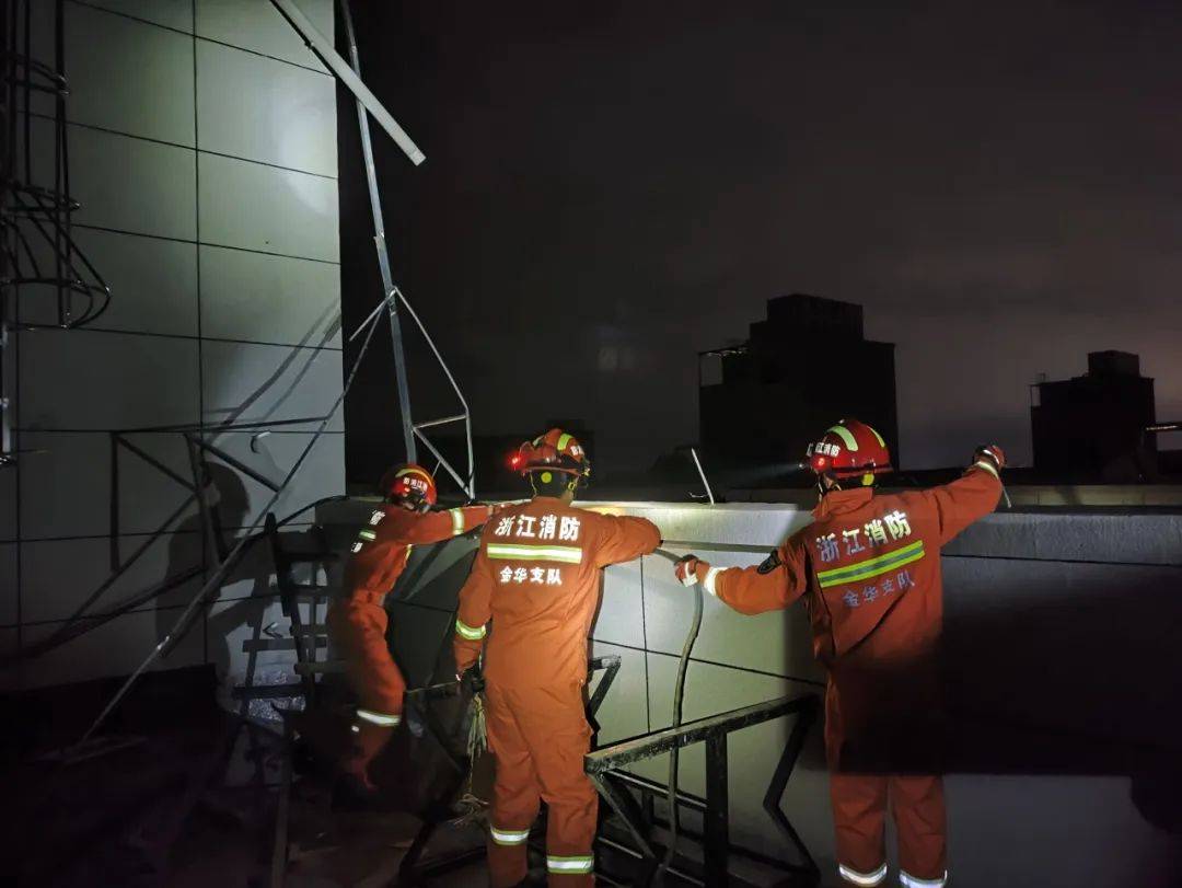 3月25日17时50分,东阳一企业楼顶顶棚铁皮被大风掀翻,悬挂在外墙处,摇摇欲坠。