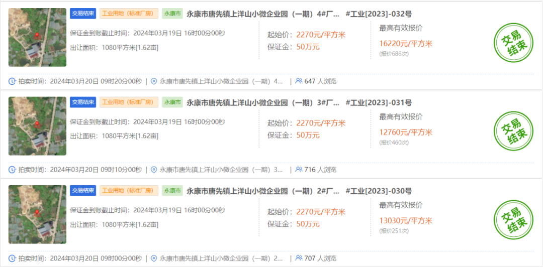 3月20日,永康市唐先镇上洋山小微企业园(一期)2#、3#、4#厂房地块土拍结束!