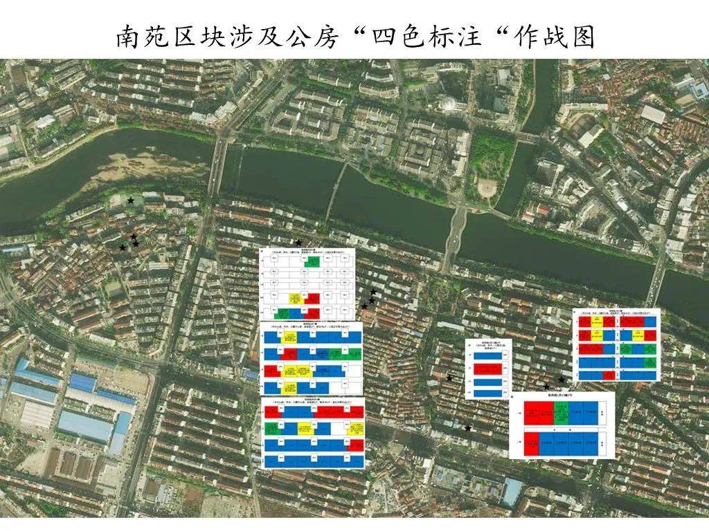 我市南苑区块有公房164套(间),涉及租户164户。为落实南苑区块征迁目标,截止目前,有关部门累计走访公房租户240多人次,深入了解租户情况及诉求,并进行分析,明确阶段性目标,创造条件、推动腾空、限时销号。建立公房腾空进展“红黄蓝绿”四色标注作战图其中:“蓝色”为已完成腾空对象;“绿色”为基本确定安置方案的对象;“黄色”为还需要做思想工作的对象;“红色”为不符合对象等有违反规定需清退的。