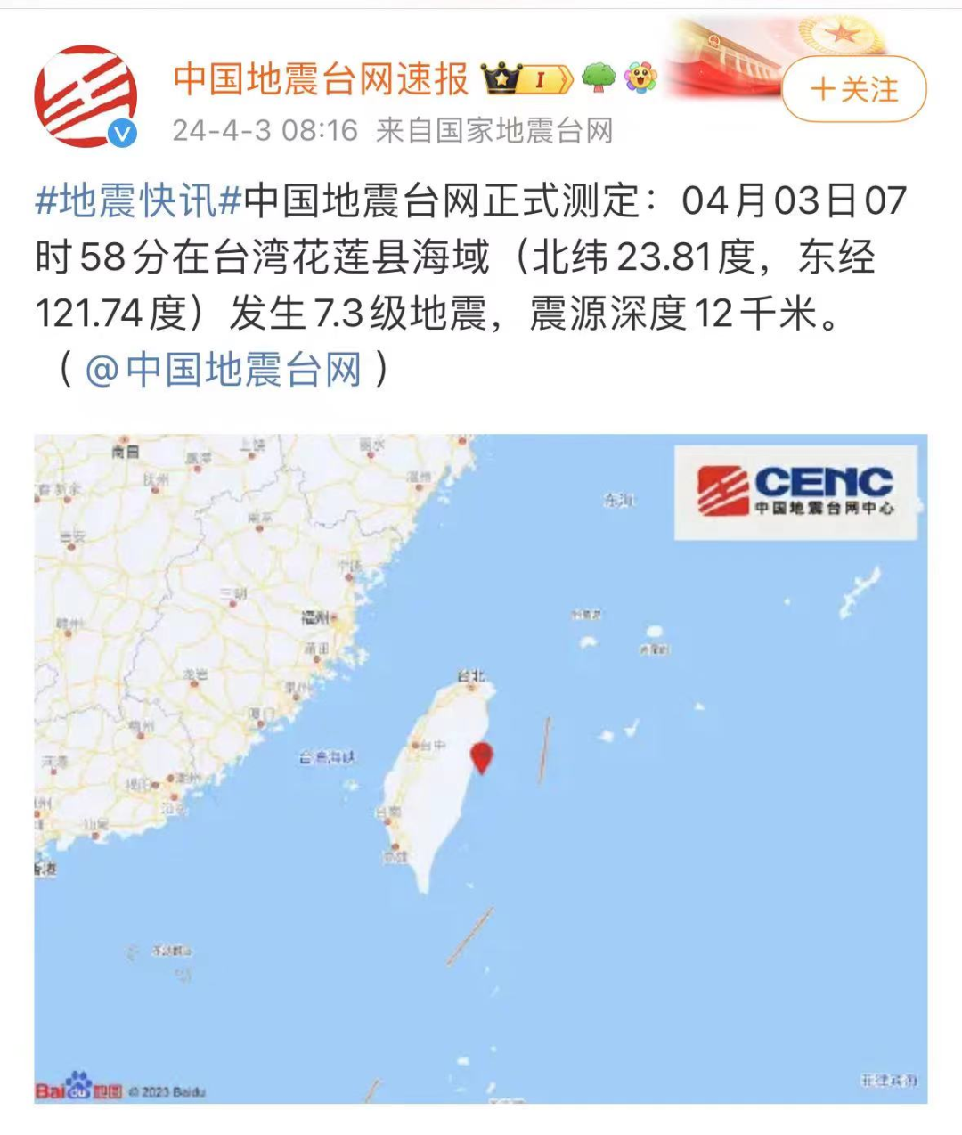 台湾发生7.3级左右地震