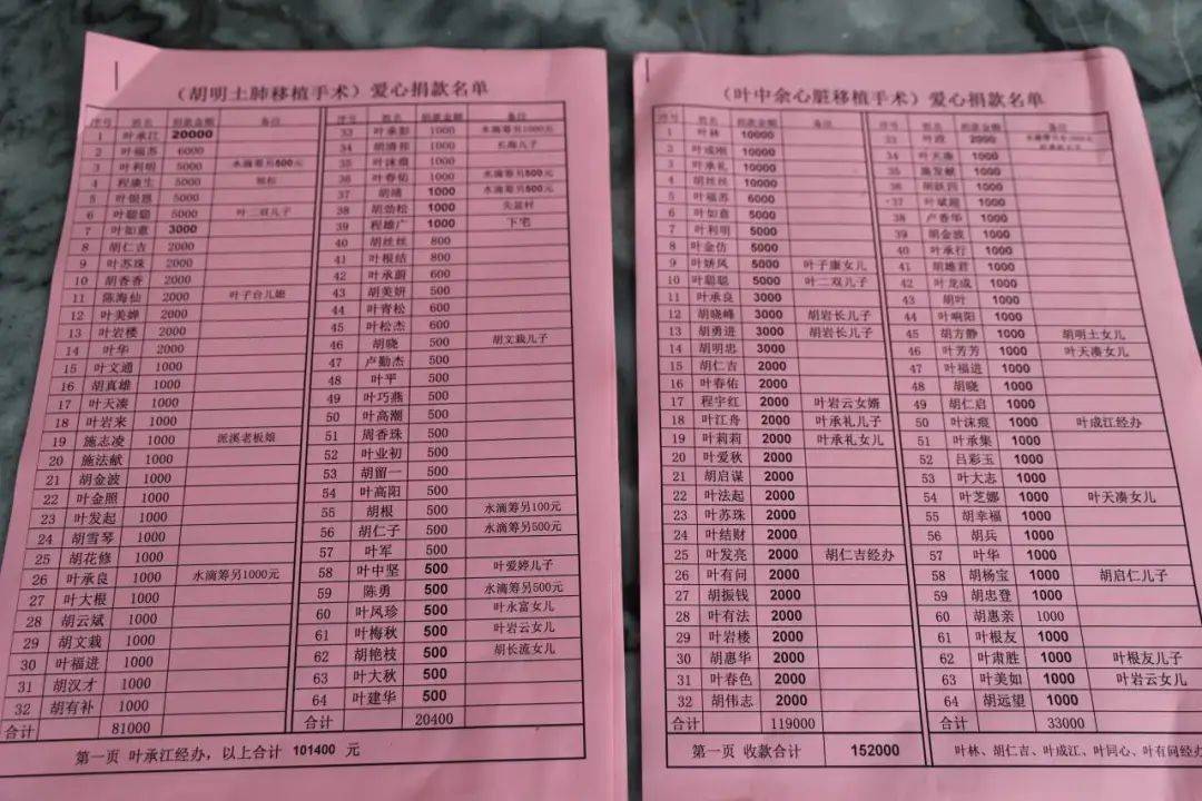 本村女婿程宇红捐款5万元、叶子康女儿叶娇凤5000元、叶成理妹妹捐款500元……记者看到两次爱心捐款名单中详细记录了每位村民的捐款,其中有不少外嫁女、本村女婿以及周边村村民的备注。