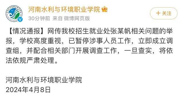4月8日中午,河南水利与环境职业学院官博发布情况通报: