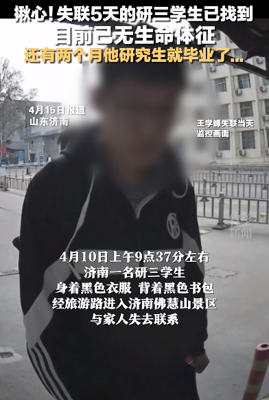 4月10日上午9时37分左右,济南一名研三学生王学峰身着黑色衣服,背着黑色书包,经旅游路进入济南佛慧山景区,与家人失去联系。随后警方及多支救援力量在佛慧山上搜寻。