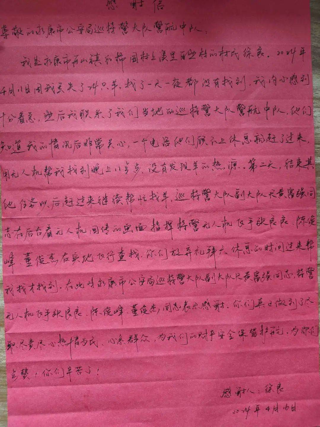 “我们家可就指望这些羊,幸亏你们帮忙找回来了。”近日,永康市石柱镇上溪里村村民徐某及家人来到市公安局巡特警大队,送来一封感谢信和一面印有“尽职尽责热情为民,失而复得温暖我心”的锦旗,感谢民警帮其寻回24只山羊。