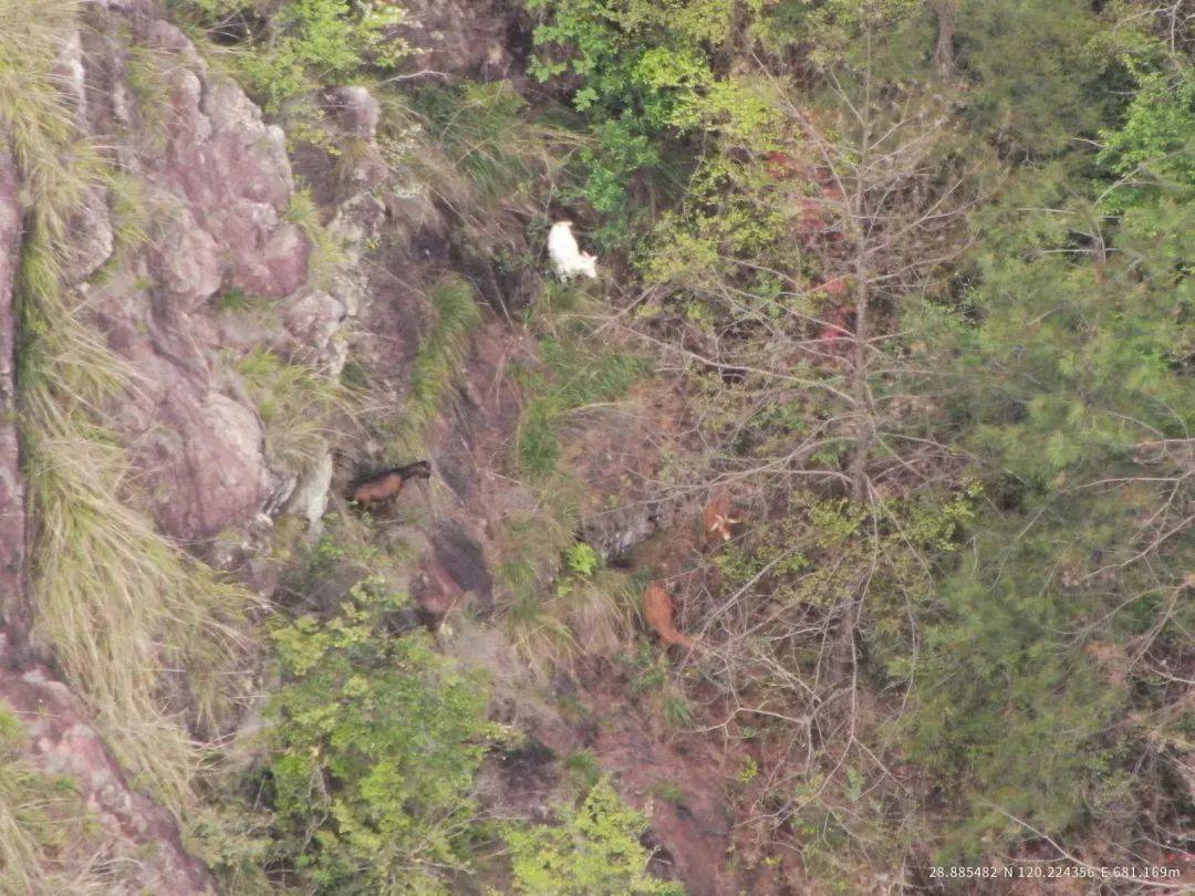 接警后石柱派出所联系市巡特警大队请求增援,巡特警大队警航中队遂派员前往现场,以羊的失踪点为中心,利用无人机对周边进行高空热源搜索。然而,羊群失踪的区域山势陡峭,植被繁茂,无人机热成像效果不佳,搜寻到夜里11时仍未发现羊群踪迹。考虑到羊群数量较大,且走失时间较长,次日,民警总结前一日的搜索经验,选择以羊群中较为显眼的白羊为参照物,配合使用云台相机可见光功能,扩大范围再次展开搜寻排查。