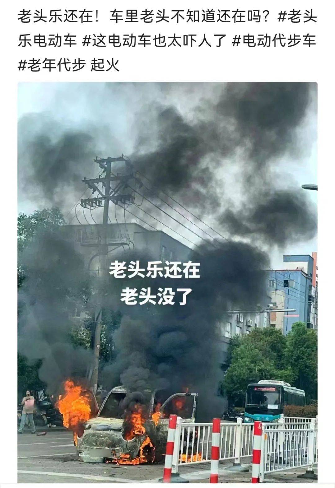 4月16日,潘某在某平台发布了一张某路段一车辆起火的图片,并配文:“老头乐还在,老头没了”。