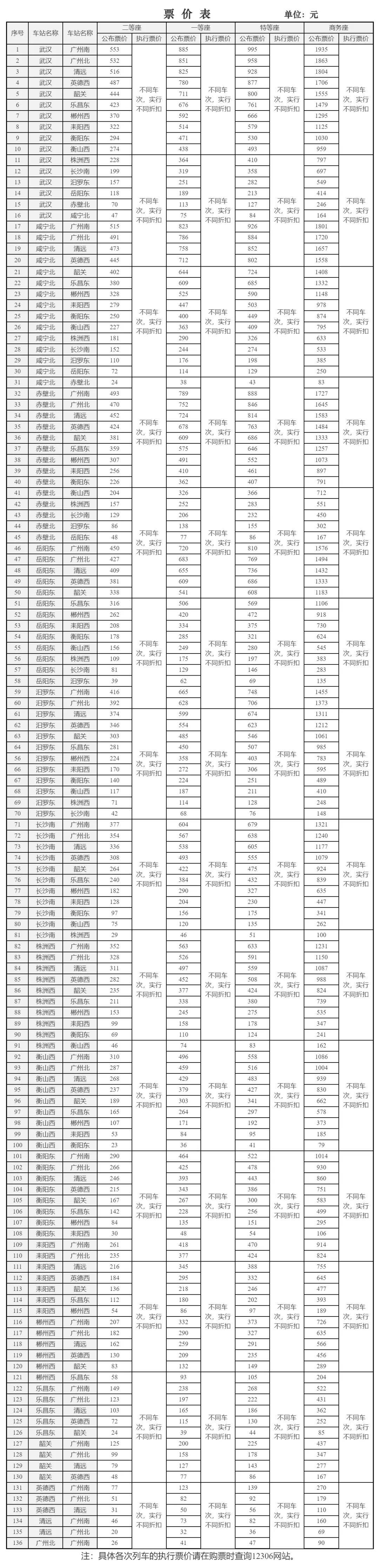 据武广铁路客运专线有限责任公司发布的武广调价公告显示,如武汉站至广州南站的二等座最低票价为304元,较现票价低约34%。据沪杭铁路客运专线股份有限公司发布的沪杭调价公告显示,如上海虹桥站至杭州东站的二等座最低票价为48元,较现票价低约34%。据沪昆铁路客运专线浙江有限责任公司、沪昆铁路客运专线江西有限责任公司、沪昆铁路客运专线湖南有限责任公司发布的杭长调价公告显示,如杭州东站至长沙南站的二等座最低票价为267元,较现票价低约34%。据杭甬铁路客运专线有限责任公司发布的杭甬调价公告显示,如杭州东站至宁波站的二等座最低票价为47元,较现票价低约34%。