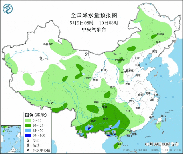 中央气象台5月9日06时继续发布大风蓝色预警:预计,5月9日08时至10日08时,辽宁中北部、吉林中部、内蒙古大部、新疆东部和南疆盆地、青海西部、甘肃西部、宁夏大部、陕西北部、河北南部等地的部分地区有5~6级、阵风7~9级的大风;渤海、渤海海峡、黄海北部、台湾海峡、巴士海峡、南海东北部海域将有7~8级、阵风9级的大风。5月10日08时至11日08时,内蒙古大部、黑龙江中西部、吉林中西部、辽宁中西部、新疆南疆盆地、甘肃中东部、宁夏大部、陕西北部、山西中北部、河北北部和南部、山东北部等地的部分地区有5~6级、阵风7~9级的大风;渤海、渤海海峡、黄海北部和中部海域将有7~8级大风、阵风9~10级。贵州到华南一带未来三天雨连连 东北华北明起或有强对流侵扰昨天,江南、华南等地的降雨将进一步减弱,其中,云南东南部、广西南部等地局地有暴雨。今天开始,中东部新一轮大范围降水过程又将上线。