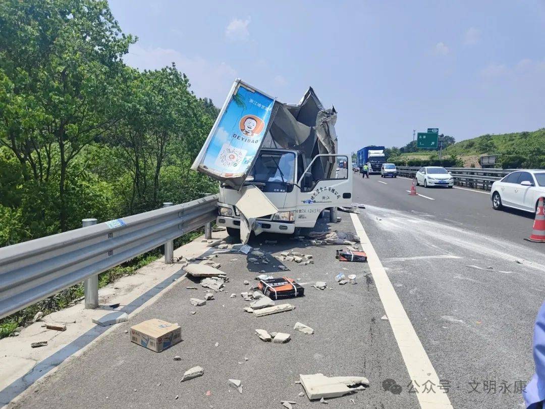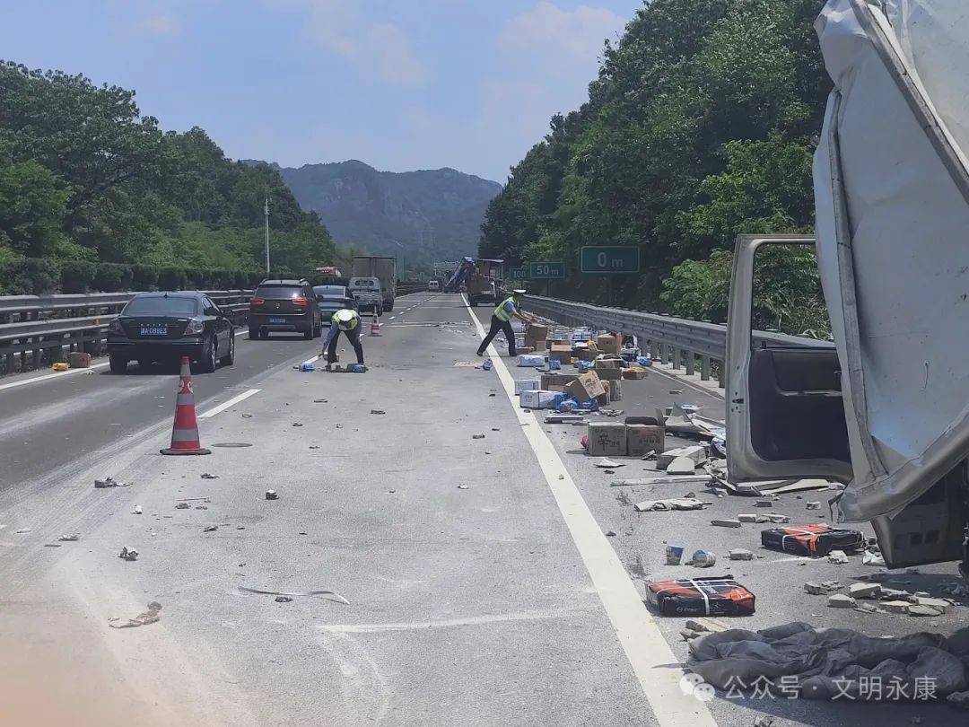 近日,在G25长深高速距离永康出口两公里处,两辆货车相撞,大量货物洒落高速主线,造成后方车辆通行受阻。事故发生后,后方受阻司乘人员纷纷下车,与随后赶到的高速交警和施救人员一同展开紧急救援。