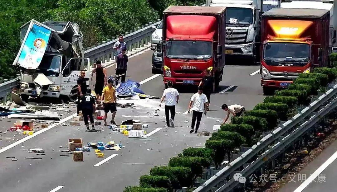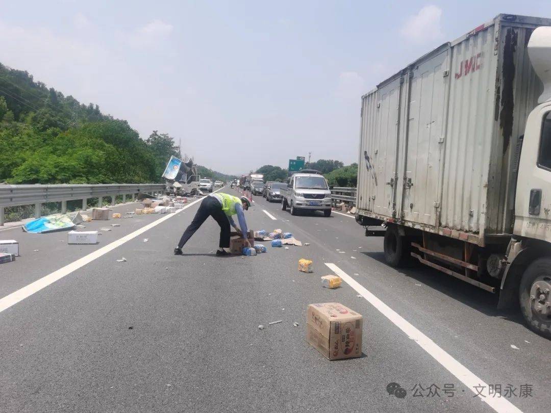 他们分工明确,有的迅速报警联系救援,有的迅速整理散落的货物,还有的负责清理车道,确保其他车辆能够安全通过。在短短3分钟内,10名过往司乘人员便齐心协力清理出一条车道,初步恢复了交通通行。