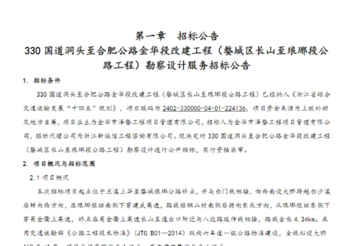 5月10日,330国道洞头至合肥公路金华段改建工程(婺城区长山至琅琊段公路工程)勘察设计服务招标文件预公示。