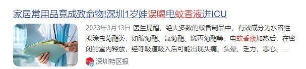 入夏以来,家住低楼层的明明一家一直饱受蚊虫困扰。尤其是一岁多的明明,白白胖胖的身体被蚊子叮咬出了一个个的大红包,连脸部上眼皮都被叮肿了,浑身痒得不行。父母看着都心疼得不得了,白天一看到蚊子就用电蚊拍打蚊子,晚上也不间断地用起了电蚊液杀蚊。前段时间的一个午后,刚刚才学会走路的明明,趁着家里人没注意,悄悄摸到了蚊香液的边上,并好奇地喝了一口蚊香液(约10毫升)。喝完之后,明明当即出现了哭闹、呛咳、呕吐的情况。等妈妈听到明明的哭喊,赶到孩子的身边时,明明紧接着又出现了剧烈抽搐的情况,整张小脸憋得发紫,看着十分吓人。惊慌失措的父母赶紧将孩子送到了浙江大学医学院附属儿童医院急诊。当孩子抵达医院时,已经完全失去了意识,呼吸、心跳都极其微弱。急诊医生立即对明明进行了气管插管、心肺复苏抢救等一系列抢救工作,并采取药物控制抽搐、缓解脑水肿以及维持内环境和循环稳定的治疗。遗憾的是,尽管医护人员尽力抢救并提供了高级生命支持,明明始终仍未苏醒。很快,孩子的病情继续恶化,出现了严重的脑水肿和脑疝。最终,明明因为脑部严重损伤而不幸离世。而像这样的儿童因误服、误用灭蚊驱蚊产品而中毒入院的事件,以前也发生过多次。近日成都媒体报道,当地也有一个1岁4个月的宝宝,因误喝蚊香液中毒身亡。蚊香液怎么会有这么强的毒性,孩子只喝了10毫升就断送了性命?面对这起令人痛心的悲剧,急诊科主任吴秀静表示,菊酯作为蚊香液的核心成分,其实是一类能够有效杀死蚊蝇的农药,具有较强的神经毒性。菊酯通过干扰昆虫的神经系统,使它们无法正常运作,最终导致蚊虫的麻痹和死亡。一般来说,蚊香液气化之后扩散到空气中,由于剂量较少,危害较少,对于除婴儿、孕妇和老人之外的普通人群来说影响可以忽略不计。但是一旦是液体状态被误入消化道后,危险就急剧增加,孩子将面临严重的死亡风险。菊酯是蚊香液中的核心成分,分为天然菊酯及化学合成菊酯:天然菊酯的主要成分为除虫菊素;化学合成的菊酯称为拟除虫菊酯,种类较多,按毒性可分为Ⅰ型菊酯和Ⅱ型菊酯。Ⅰ型菊酯:如氯菊酯和二氯菊酯等,这些化合物不含氰基,毒性相对较低。Ⅱ型菊酯:如氰戊菊酯等,这些化合物含有氰基,毒性显著更高。研究表明,Ⅱ型菊酯不仅对昆虫有较强的杀虫效果,对人类尤其是儿童也具有更大毒性。目前市面上最常见的拟除虫菊酯类电蚊香液,主要以氯氟醚菊酯和四氟甲醚菊酯这两种成分为主,浓度大多在0.3%至1.2%之间。不同浓度和类型的菊酯化合物决定了蚊香液中的毒度高低。其中,家长最要警惕含有氰基的Ⅱ型菊酯,毒性极高,对儿童的伤害更大,后果更严重。同时,除菊酯外,蚊香液还包含溶剂,通常为挥发性有机溶剂,能帮助有效成分均匀地挥发到空气中。但某些溶剂本身也可能具有一定的毒性,也会增加孩子的中毒风险。吴秀静主任表示:“误服蚊香液中毒不同于一些普通的农药中毒,目前尚无特效解毒药。当发现孩子有误服情况时,及时就诊非常关键。”儿童急性中毒是儿童意外伤害的主要原因,也是1 ~ 4岁儿童死亡的首要原因。这个年龄段的娃娃抓取能力逐渐增强、好奇心强、对周边危险因素识别能力差等因素,增加了患儿误服风险。夏天蚊香液几乎每家每户标配,怎么判断娃娃有没有蚊香液中毒呢?蚊香液中的有毒成分首要危害神经系统,中毒后的表现形式多样。可有头痛、头晕、胸闷、视力模糊、心律失常、昏迷、惊厥、抽搐、咳嗽,上呼吸道刺激症状、呼吸困难、喉咙痛、恶心、呕吐和腹痛、口腔溃疡、分泌物增多和(或)吞咽困难、胃食管溃疡,糜烂性胃炎、皮肤烧灼感、刺痒、皮疹等表现,昏迷和惊厥是危及生命的主要表现。拟除虫菊酯类杀虫剂急性中毒潜伏期为2-24小时,多数6-8小时,早期可无症状。如发现孩子误服,立即到医院就诊。如果情况严重,第一时间拨打120!在医生的指导下做好初步处理,等医生到场施救。注意不要擅自催吐,防止引起黏膜灼伤、误吸等二次伤害。日常生活中家长也要注意,不要将散装或者液体药物,比如洗衣液、农药等放入塑料瓶中,这样孩子更容易误食。儿童医院也较常接到此类急救患儿。如果发现儿童误食这些有毒物质,最好立刻送入医院救治。家里小孩或者老人、孕妇等敏感人群,最好不要用任何驱蚊产品,尽量采用蚊帐等物理驱蚊。如果一定要用,尽量放在通风的地方,切忌长时间使用,空调房间点一晚上蚊香更是有害。还有一些劣质蚊香,将菊酯类换成了敌敌畏等有机磷农药,虽然加大了驱蚊作用,但毒性相对大得多。幼儿对这类物质很敏感,如果空调房间空气不流通,很可能出现过敏,严重者还会出现头晕、胸闷等中毒现象,电蚊香液也是一样。