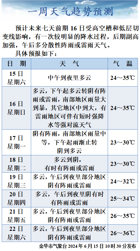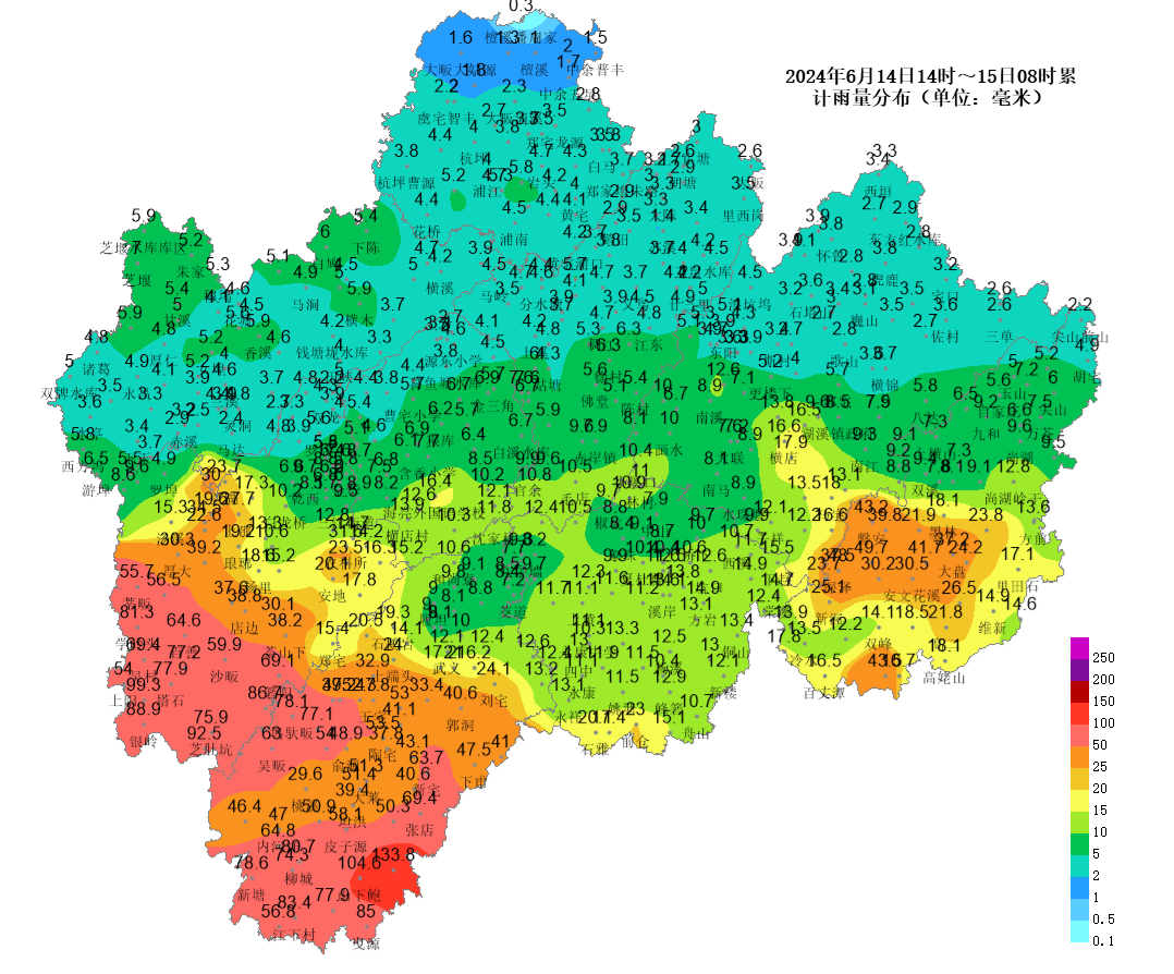 2024年6月14日14时至15日08时,全市平均面雨量17毫米,其中武义44.8毫米、婺城36.9毫米、磐安16.5毫米、永康12毫米、金东7.4毫米、东阳6.7毫米、兰溪5.4毫米、义乌5.2毫米、浦江3毫米。累计雨量大于50毫米的站点有39个,大于100毫米的站点有2个,最大为武义县新宅镇安凤村站133.8毫米;最大小时雨强70.8毫米。出现7级以上大风站有2个,最大为武义新宅镇安凤村站17.5米/秒。