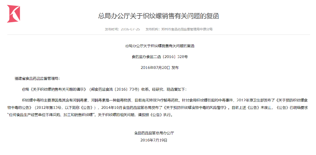 👉2022年4月28日,广东省市场监督管理局发布食品安全消费提醒,其中提到“不食用野蘑菇、鲜黄花菜、河豚鱼、织纹螺以及一些可能具有毒性或有寄生虫风险的产品”。👉佛山、韶关等地市场监管部门也发布了食品安全消费提醒,其中提到“不食用野蘑菇、鲜黄花菜、河豚鱼、织纹螺以及一些可能具有毒性或有寄生虫风险的产品”。👉深圳市市场监管局曾发布提醒,学校食堂要禁用织纹螺等食品。福建省泉州市海洋与渔业局也发布提醒,每年4到9月是织纹螺毒性最强的时候,食用后可产生头晕、呕吐、口唇及手指麻木等中毒症状,潜伏期最短5分钟,最长可达4小时。提醒大家外出用餐切勿食用织纹螺,以免发生意外。来源:广州日报 看看新闻 央视财经 上观新闻 温州晚报 温岭发布