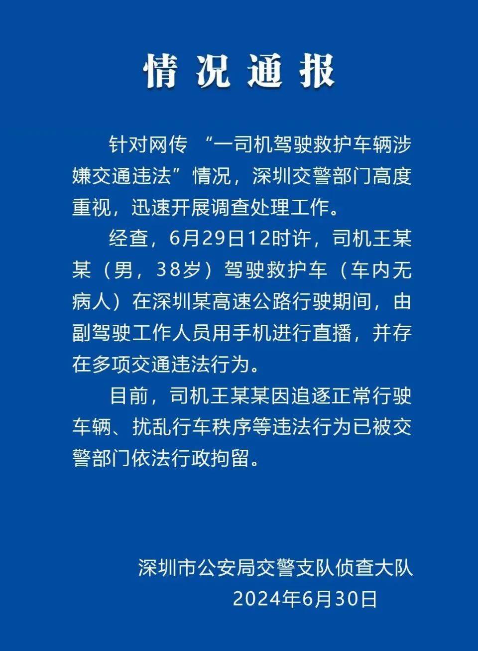 6月30日晚,针对此视频,深圳市公安局交警支队侦查大队发布情况通报。官方通报:涉事救护车司机因追逐正常行驶车辆等违法行为被行拘针对网传 “一司机驾驶救护车辆涉嫌交通违法”情况,深圳交警部门高度重视,迅速开展调查处理工作。经查,6月29日12时许,司机王某某(男,38岁)驾驶救护车(车内无病人)在深圳某高速公路行驶期间,由副驾驶工作人员用手机进行直播,并存在多项交通违法行为。目前,司机王某某因追逐正常行驶车辆、扰乱行车秩序等违法行为已被交警部门依法行政拘留。