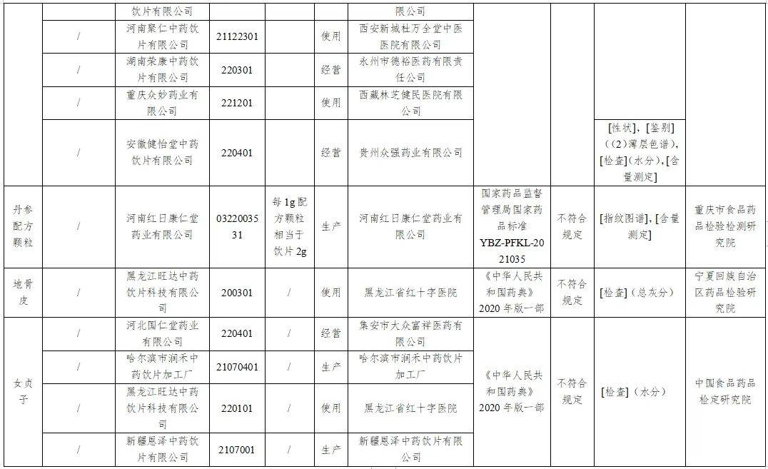 经中国食品药品检定研究院检验,标示为河北国仁堂药业有限公司、哈尔滨市润禾中药饮片加工厂、黑龙江旺达中药饮片科技有限公司、新疆恩泽中药饮片有限公司生产的4批次女贞子不符合规定,不符合规定项目为水分。