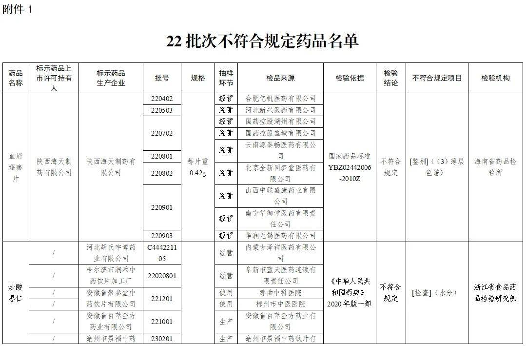 一、经海南省药品检验所检验,标示为陕西海天制药有限公司生产的7批次血府逐瘀片不符合规定,不符合规定项目为鉴别。