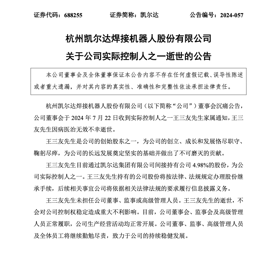 7月22日晚间,杭州凯尔达焊接机器人股份有限公司(以下简称“凯尔达”)公告披露,公司董事会于当天收到实际控制人之一王三友家属通知,王三友因病医治无效不幸逝世。王三友为公司的创始股东之一,目前通过凯尔达集团有限公司间接持有公司4.98%的股份,为公司实际控制人之一。